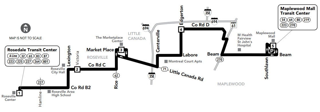 Route 223 goes east-west and connects Roseville, Little Canada, and Maplewood from Rosedale Center to Maplewood Mall.