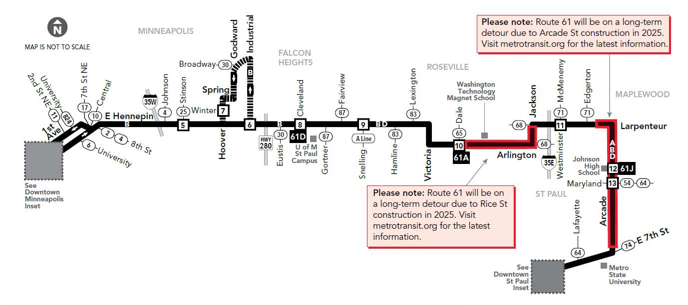On the south side of Roseville on Larpenteur Ave you can take Route 61. This local bus goes east and west between downtown Saint Paul and downtown Minneapolis. Portions of Route 61 between Dale St and E 7th Street are on long-term detour due to construction on Rice Street and Arcade Street in 2025.