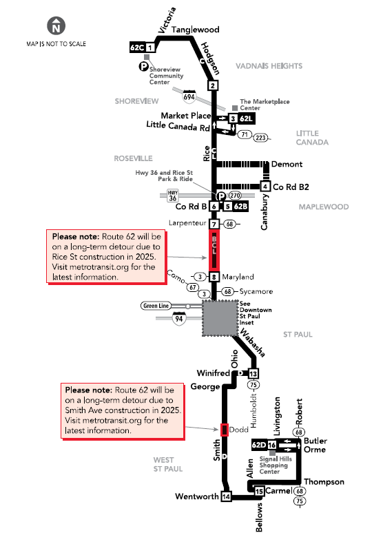 Route 62 goes up and down Rice Street from Shoreview to downtown Saint Paul, through Roseville. It is currently on a long-term detour due to Rice Street Construction. Route 62 is detoured off Rice St from Maryland Ave to Larpenteur Ave until further notice.