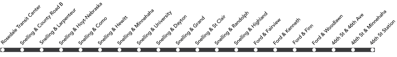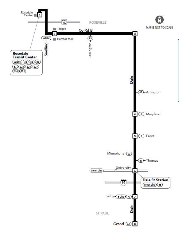 The Metro A Line is a rapid transit bus route that comes every few minutes at a few key bus stops up and down Snelling Avenue. Get on at Rosedale Transit Center and hop off at Snelling and County Rd B or take it to Larpenteur Ave. You can keep going down to University Ave to catch the Green Line light rail to downtown Minneapolis or Saint Paul. The A Line goes all the way south to Minnehaha Ave and 46th Street in Saint Paul.