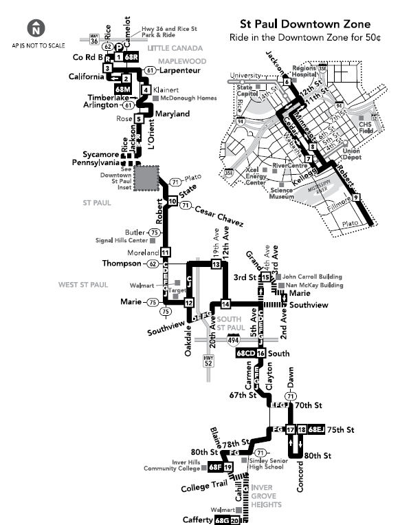 Route 68 also goes up and down Rice Street starting at Highway 36 and Rice St. The Roseville portion ends at Larptenteur Ave, but the route goes all the way to Inver Hills Community College. This route is also currently detoured due to Robert Street Construction.