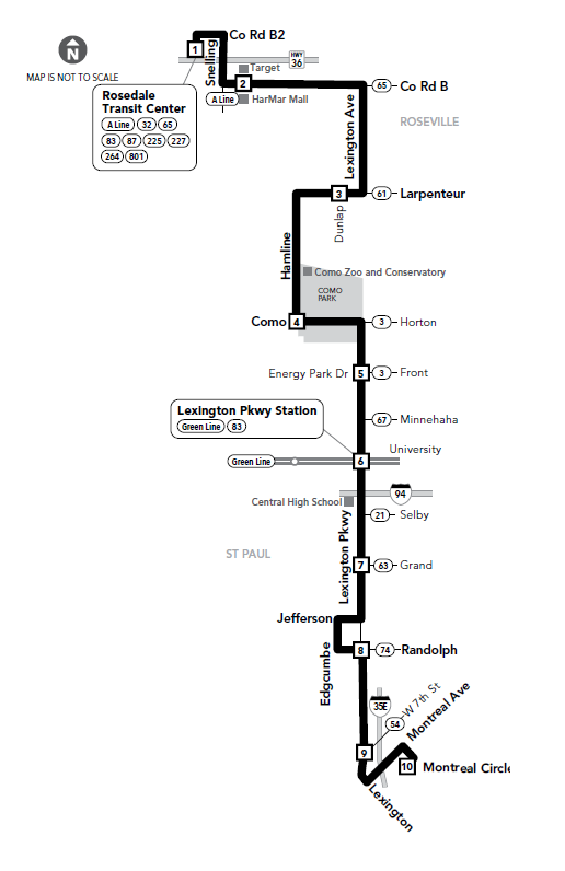 Route 83 also starts at Rosedale Center and goes down Snelling to County B, and then it goes south on Lexington Avenue. It takes a couple quick jogs off Lexington Ave, but stays close and stays mostly north/south on Lexington until it ends at Montreal Ave and Lexington Parkway South. You can get off at University Ave to grab the Green Line from Route 83 too.