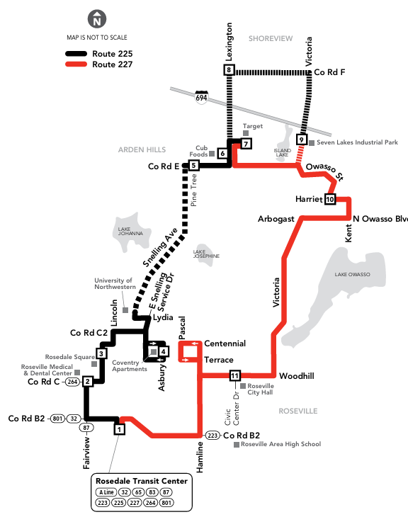 On the north side of Roseville, you can take Route 225 and Route 227, which create a loop up Snelling Ave and Victoria St and into Shoreview. You can get on either one at Rosedale Center or Island Lake County Park on Victoria St in Shoreview. Route 225 goes around the eastern side of the loop and 227 goes around the east.