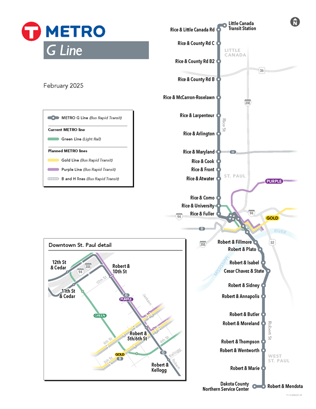 Phase 1 involves the northern part of the route and work is already underway to construct new enhanced bus stops, in coordination with Ramsey County and the City of Saint Paul. The new Little Canada Transit Station will be constructed starting in 2026. The nothern part of of the Metro G Line could be ready to ride starting in 2027 with the southern part ready in 2028.