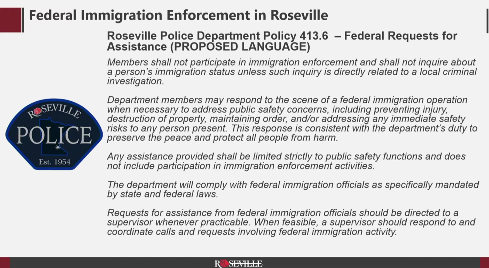 The city council also reviewed an update to the Roseville Police Department's Policy 413.6 related to federal requests for assistance, but sent it back for further revision.