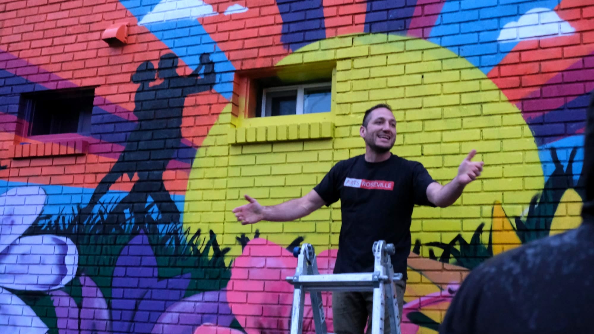 He was given an open-ended brief, with some basic concepts and ideas. Arts Roseville wanted it to be bright, beautiful, and representative of the community. The final result: a sun shining brightly over colorful flowers, with silhouettes of people dancing, making music, ice skating, and playing with a dog. The word ROSEVILLE is emblazoned in large letters vertically along the right edge of the wall. On the left, logos for The Roseville Area Community Foundation and Arts Roseville are painted.