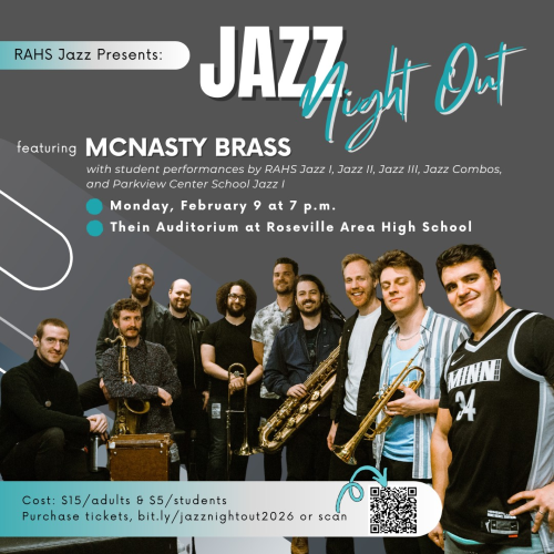 "Get ready for an evening of music at Jazz Night Out—featuring McNasty Brass alongside student performances by RAHS Jazz I, Jazz II, Jazz III, Jazz Combos, and Parkview Center School Jazz I!"
