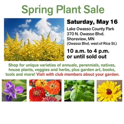 Local gardeners in two garden clubs are collaborating on a joint garden club annual plan sale to be held at Lake Owasso County Park in Shoreview on May 16. A variety of annuals, perennials, natives, house plants, and veggies and herbs will be available 10:00 a.m. to 5:00 p.m. or until sold out. The sale will also include garden art, books, tools, and other items.