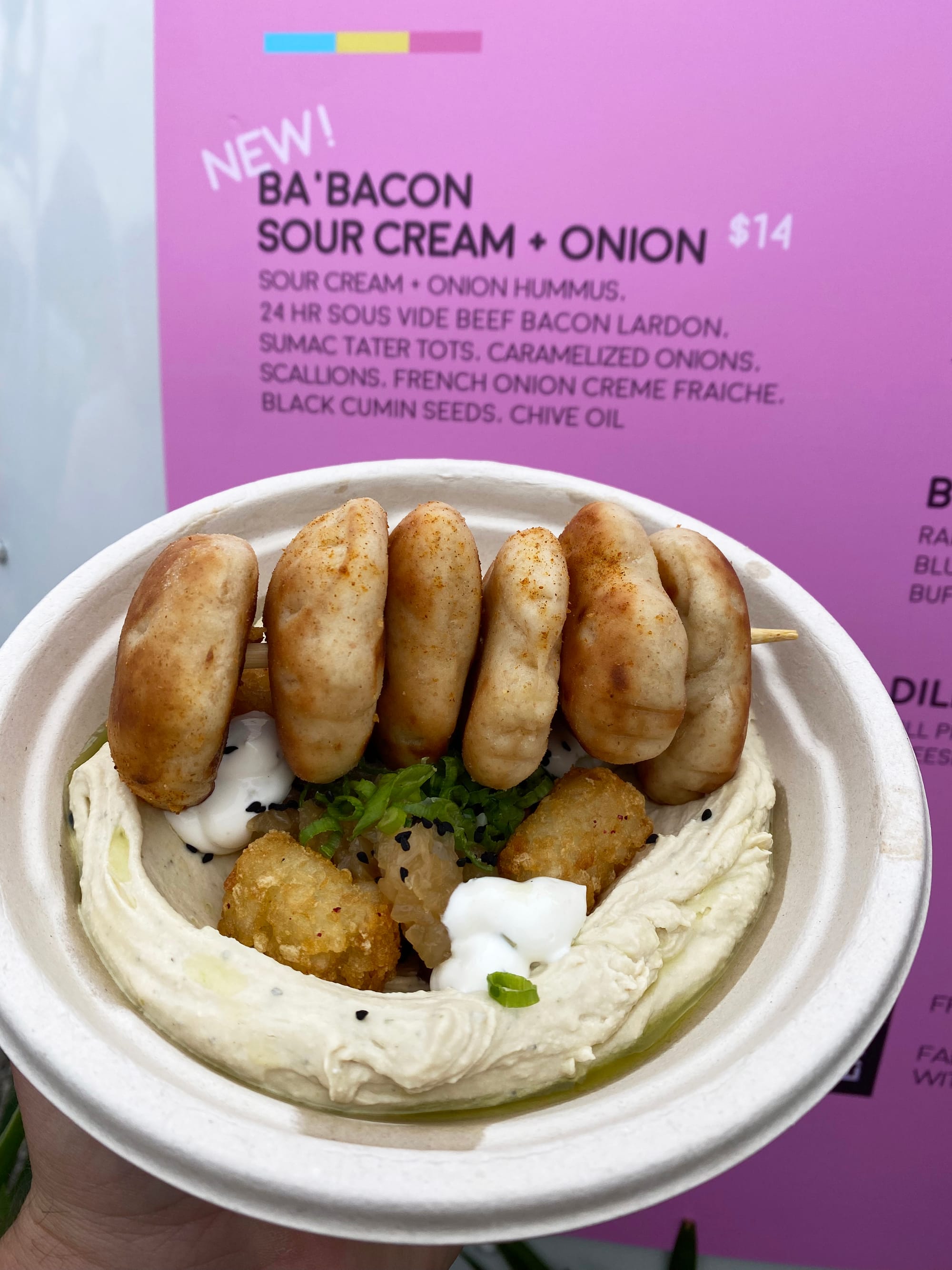 These hummus bowls are delightful! They all come with little pita puffs that are perfectly sized for dipping.