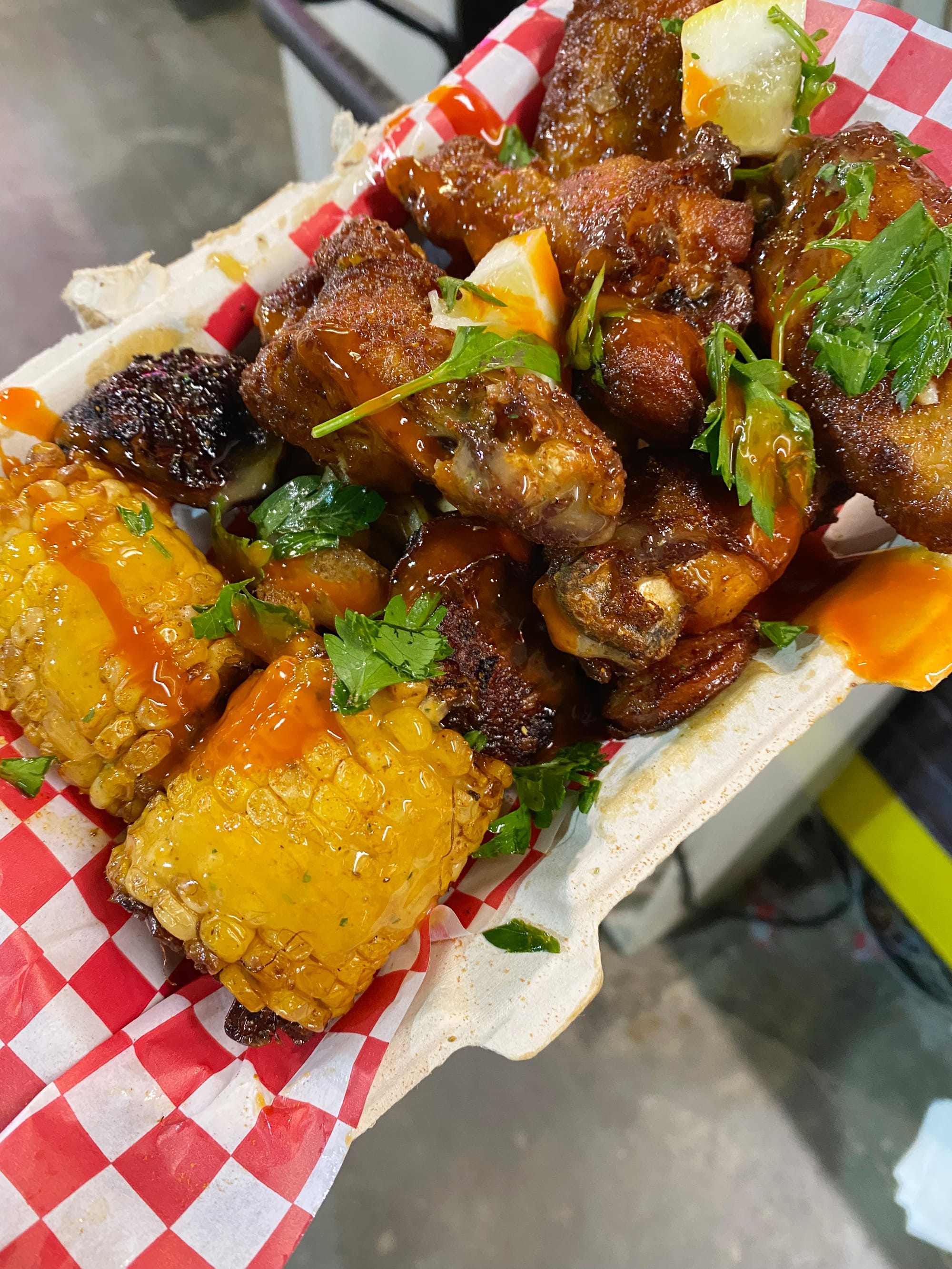 Usually I would recommend sharing this pile of chicken wings, corn, sausage and potatoes, but I was hungry and ate the whole thing myself.