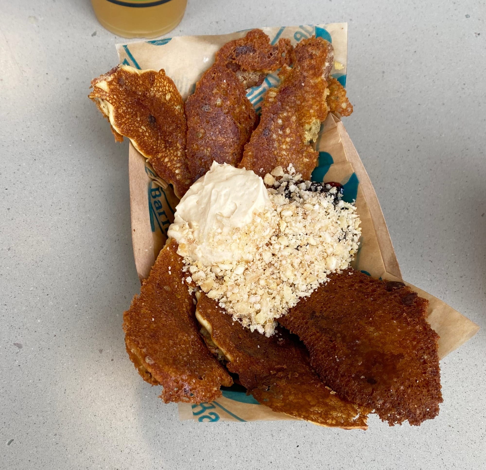 Pancake battered bacon on its own would be something special but then you get peanut butter whipped cream and jelly. It’s sweet and savory and slices nicely for sharing.