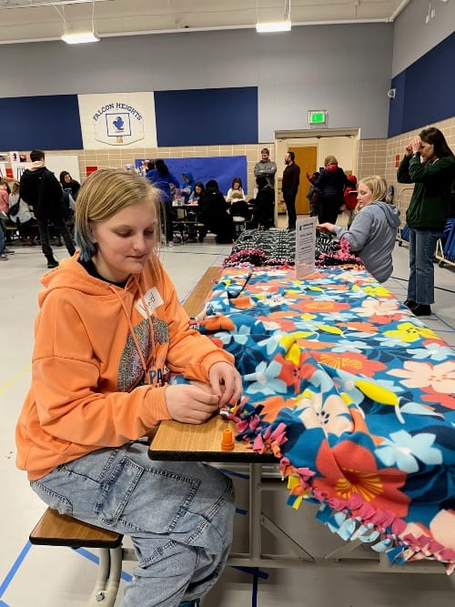 The annual event, created by the Falcon Families for Equity and Justice (FFEJ) and the school PTA, is a chance for the community to dig into hands-on projects of community service. Families filled food bags with donations, made fleece blankets and stuffed animals and “Welcome Home” signs for Habitat for Humanity.