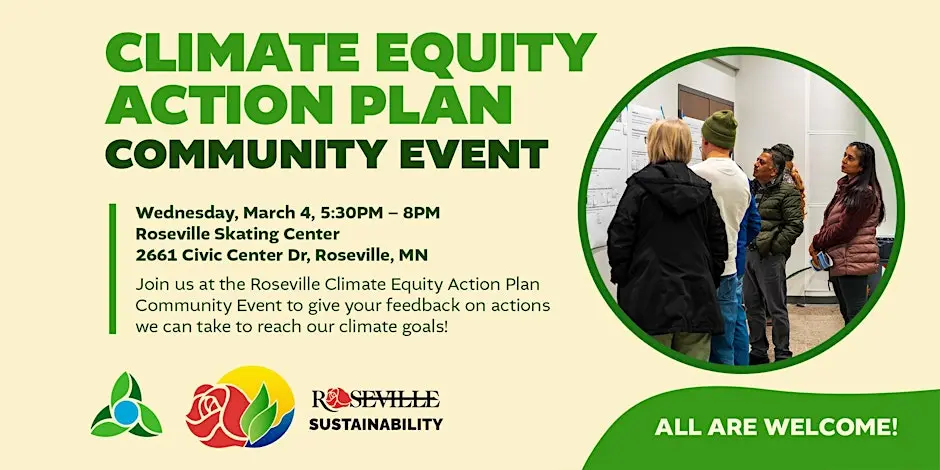 "Join us at in the Rose Room at the Roseville Skating Center for an exciting community event focused on creating a more equitable climate future for Roseville! This in-person event will give you a chance to provide your ideas for actions to address climate change while prioritizing equity and justice. A free meal and a kids' activity table will be provided!"