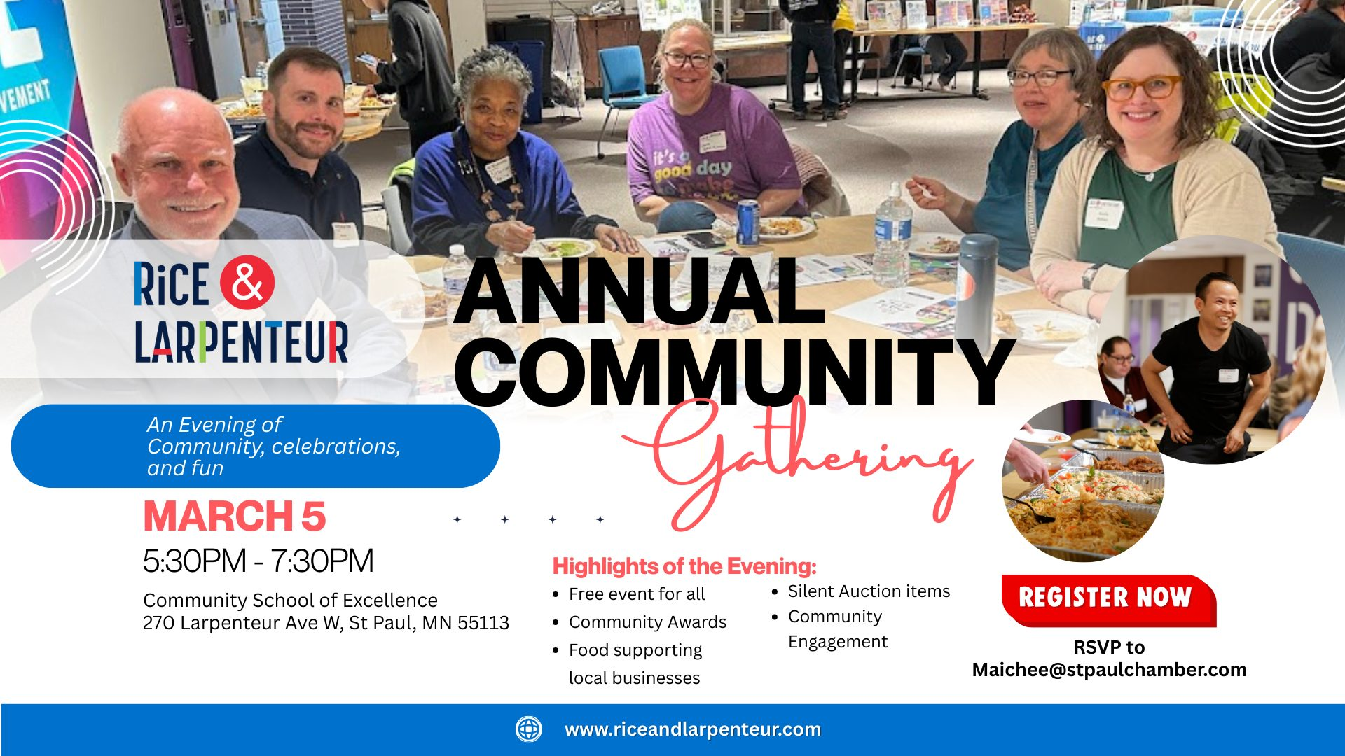"Come join us at Rice & Larpenteur's Annual Community Gathering 2026 for community engagement, food & giveaways, silent auction and more. All are welcome! ... Join us at Community School of Excellence to engage with local neighbors and business to celebrate our progress and help strengthen the Rice and Larpenteur community."