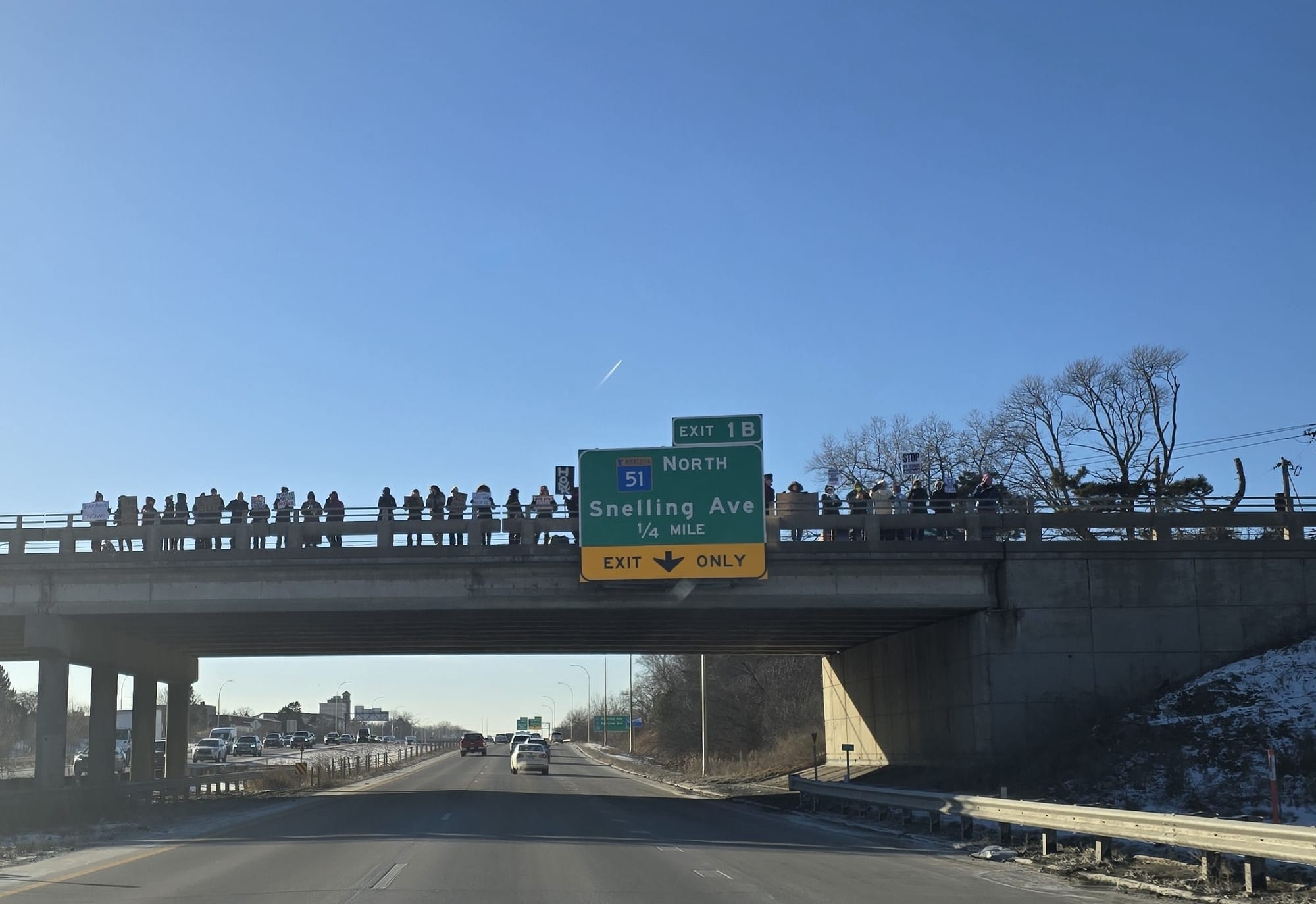 Do Good Roseville organized a demonstration on the Hamline Ave bridge across Highway 36 on Jan. 28. | photo credit: first photo courtesy of Do Good Roseville; second photo by Kathy Berdan for The Roseville Reader