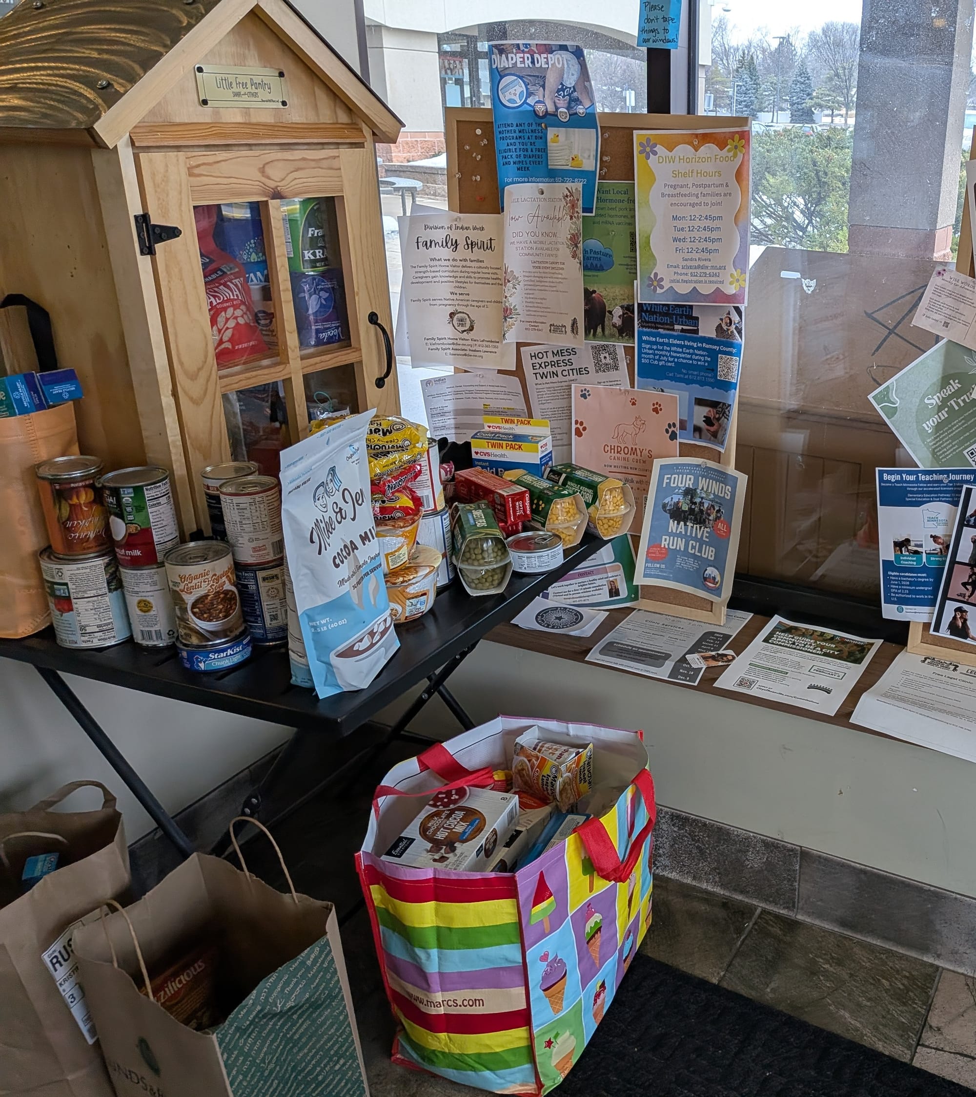 At Makwa Coffee, the entry was stocked with whistle kits, a little free pantry overflowing with food items, and fliers pinned to the bulletin board about reporting ICE activity and contacting Roseville city council to "Say NO to ICE Cooperation."