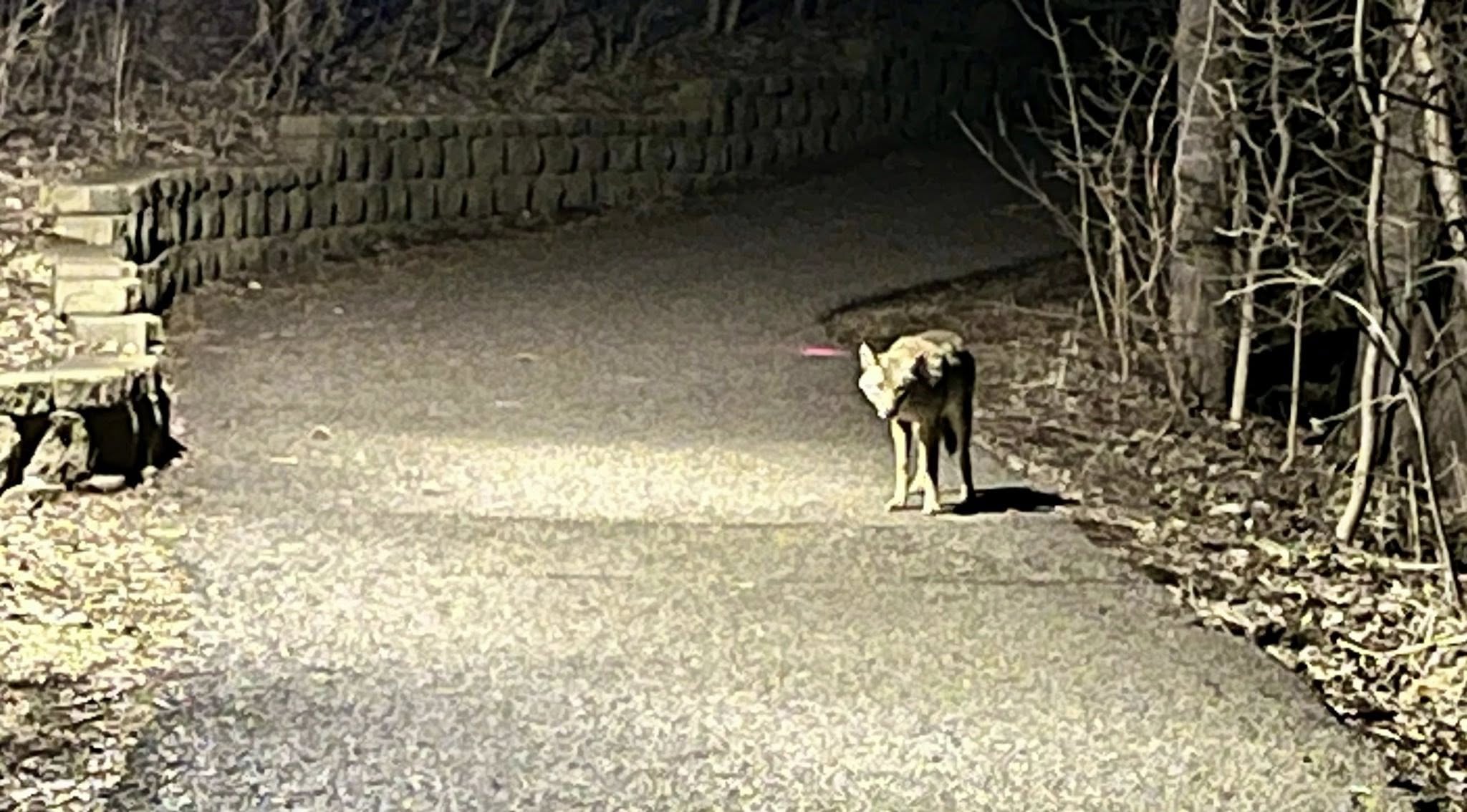 “At one point Sunny kept looking back behind us. This coyote came out on the path and followed us for a bit. Had to shoo it away a couple times,” Franke wrote in a post in the Roseville MN Neighbors and Community group on Facebook. (Shared here with permission). Franke took this video of the coyote on the trail: